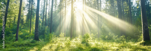 Morning sunlight filtering through tall trees in a serene green forest