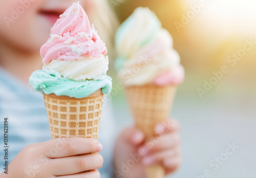 Children enjoying colorful ice cream cones on a sunny day outdoors