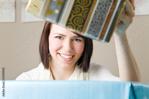 Junge blonde Frau hält viele bunte Geschenkschachteln