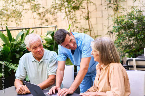Healthcare professional engaging with seniors in a rehabilitation facility garden