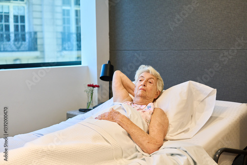 Senior woman resting in a bright, modern rehabilitation facility bedroom