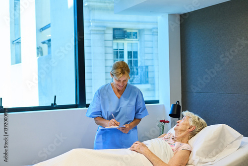Nurse attending to resting senior patient in medical rehabilitation facility