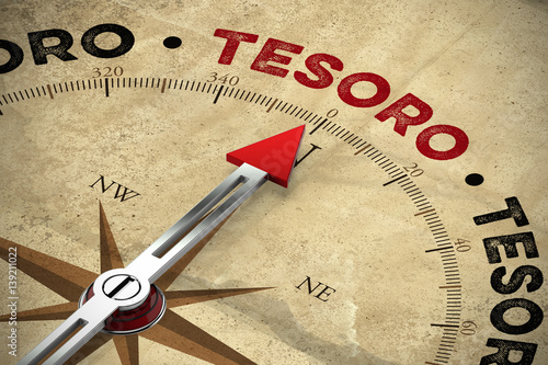 Alter Kompass zeigt auf das Wort Tesoro / Schatz