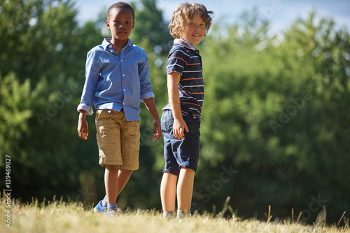 Zwei Jungen im Sommer blicken neugierig