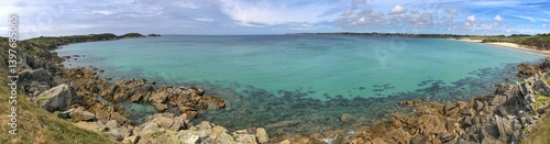 Scenic coastal panorama of a serene turquoise bay with rocky shoreline and sky