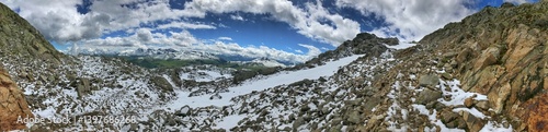 Panoramic alpine landscape with rocky terrain and snow under a vibrant sky
