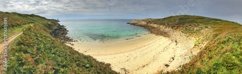 Wide panoramic view of a secluded beach surrounded by lush greenery