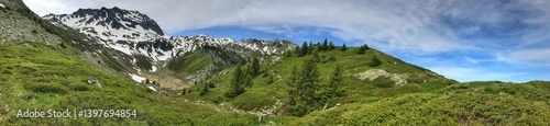 Panorama of alpine valley with snow-capped mountain and lush green meadow scenery