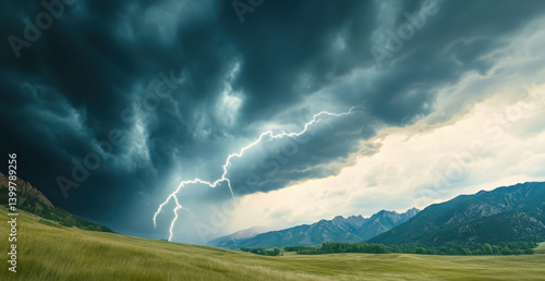 Dramatic stormy sky with lightning over a scenic mountain landscape