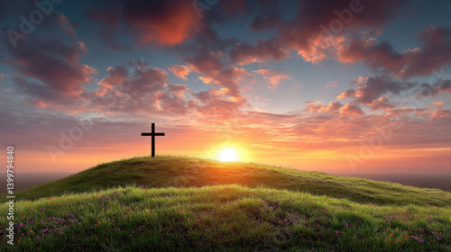 Easter sunrise with cross on a green hill and vibrant sky