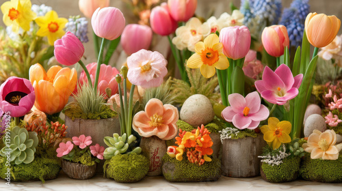 Springtime Easter garden scene with colorful tulips, daffodils, and delightful decor