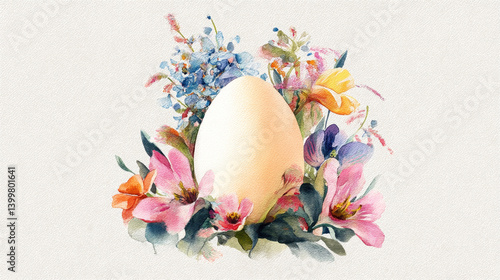 Watercolor illustration of an Easter egg surrounded by colorful spring flowers
