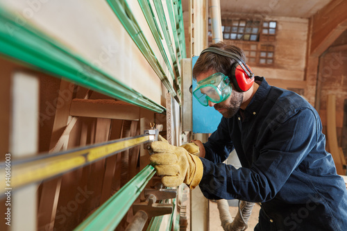 Schreiner sägt Holz mit vertikaler Plattensäge