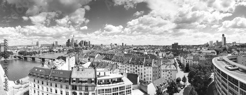 Panoramic cityscape view with modern skyline and river under cloudy sky