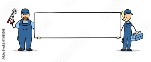 Fensterputzer und Gebäudereiniger halten leeres Schild