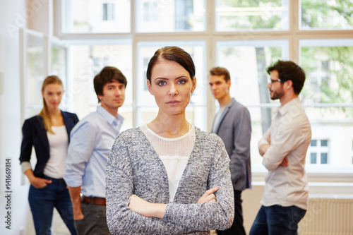 Geschäftsfrau steht zufrieden vor Business Team