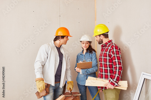 Handwerker besprechen Planung von Sanierung