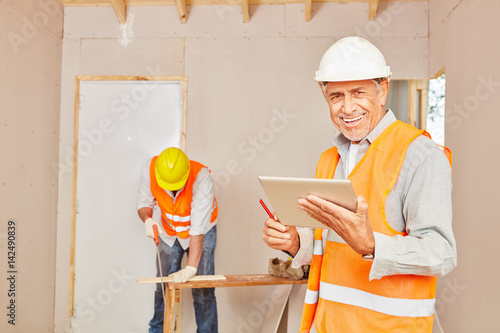Young male construction worker wearing safety workwear installing door at incomplete house