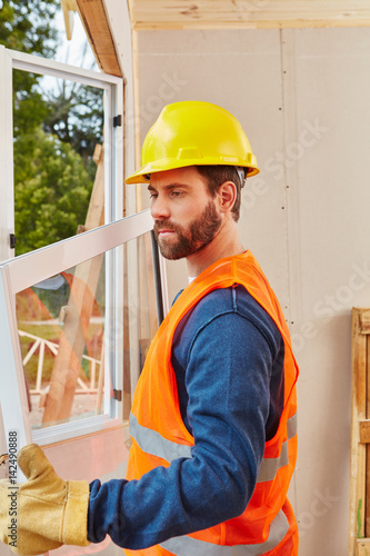 Young male construction worker wearing safety workwear carrying window frame at incomplete house