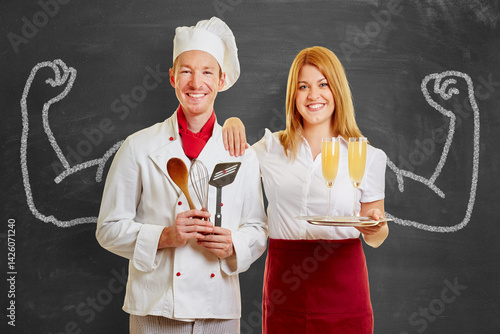 Koch und Kellnerin vor Tafel mit Muskel Armen