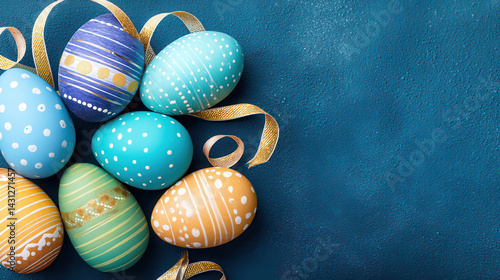 Colorful pastel Easter eggs arranged on light blue with copy space
