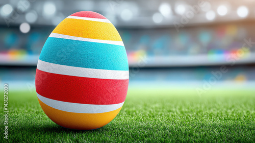 Colorful Easter egg displayed on grass in a vibrant sports arena