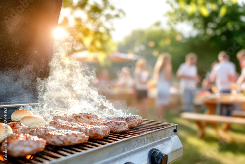 Outdoor barbecue with burgers grilling during a sunny family gathering