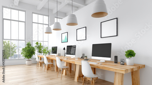 Bright minimalist study room as digital illustration with white empty picture frame mock-up for poster design (Generative AI)