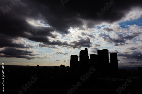 Panoramic view of cityscape under dramatic storm clouds and skyline
