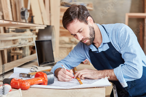 Handwerker in Werkstatt zeichnet Plan