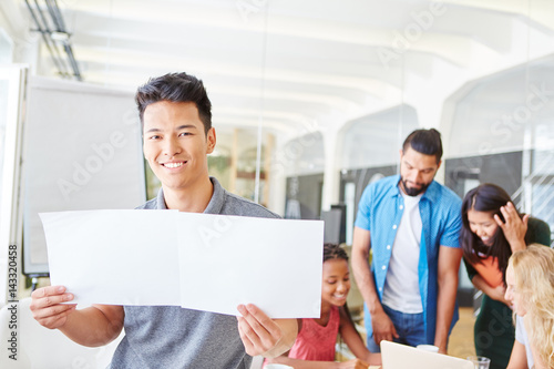 Start-Up Mann hält Zettel hoch