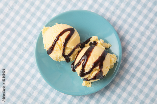 Selbstgemachtes Vanilleeis mit Schokoladensauce