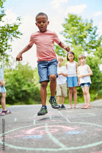 Mädchen hüpft konzentriert beim Hüpfspiel
