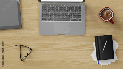 Arbeitsplatz mit Schreibtisch im Büro von oben