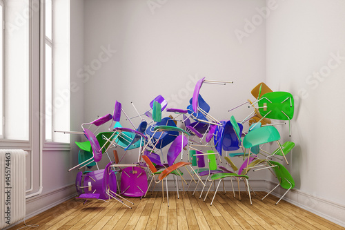 Kleiner Raum mit vielen Stühlen chaotisch gestapelt