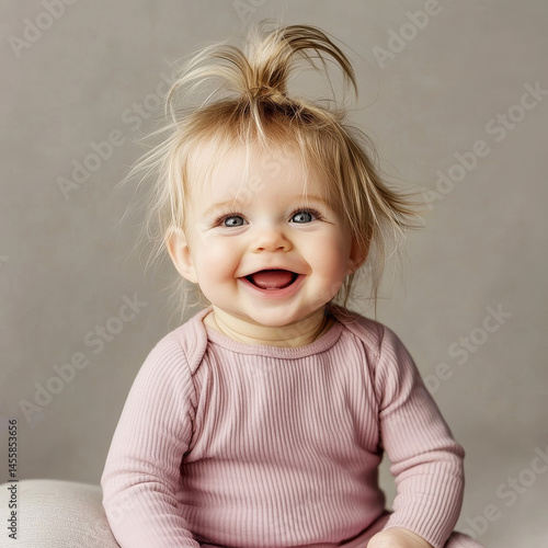 Adorable baby girl with fluffy blonde hair smiling joyfully
