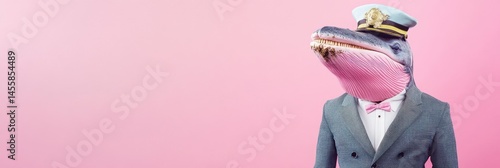 Humpback Whale Wearing Naval Suit on Vibrant Pink Background