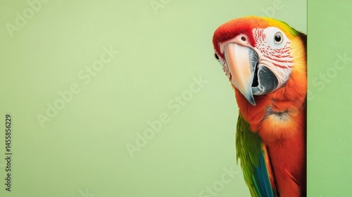 Vibrant studio portrait of a colorful scarlet macaw parrot with bright feathers against a vivid red background, showcasing its detailed and striking appearance in a professional photoshoot.