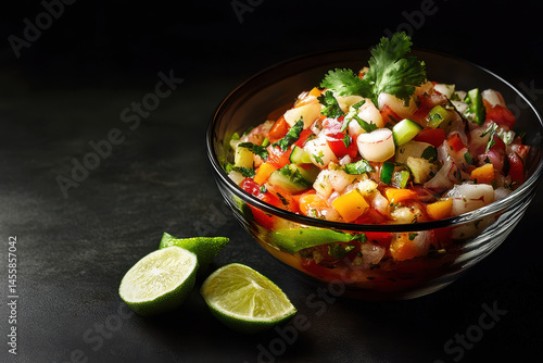 Peruvian ceviche dish with fresh lime and vibrant ingredients in a dark setting