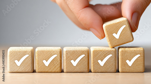 Wooden blocks with checkmarks symbolizing tasks completed and quality assurance