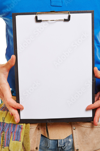 Geschäftsmann hält Klemmbrett hinter Rücken