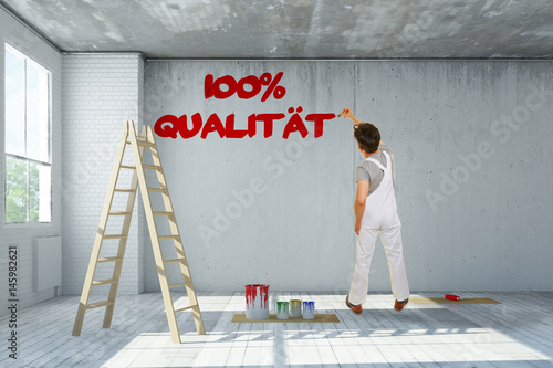 Maler schreibt 100% Qualität an Wand