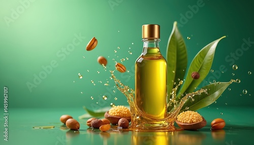 Argan oil bottle, nuts, leaves, splashes against green background. Skincare, cosmetic product. Natural organic treatment. Moroccan ingredients for beauty, health, wellness. Advertising, packaging #1459967017