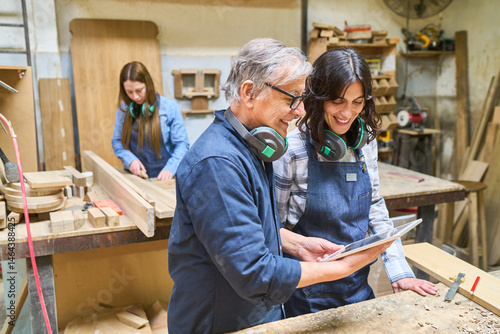 Experienced craftsman teaching young apprentice in a woodworking shop
