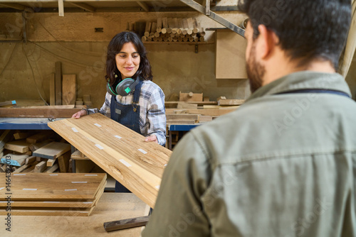 Experienced craftsman teaching young apprentice in a woodworking shop