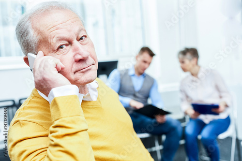 Thoughtful senior businessman with white hair drinking coffee against team discussing at workplace
