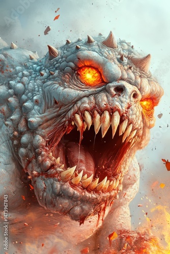 Terrifying depiction of a fiery-eyed monster roaring in rage with fiery details