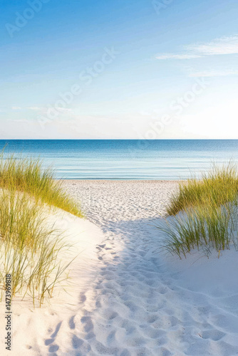 Pathway through sand dunes leading to a serene beach during a sunny day
