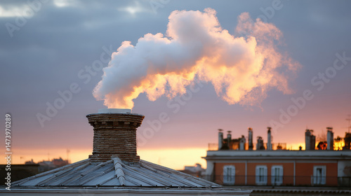 Sunset over a rooftop with smoke rising from a chimney