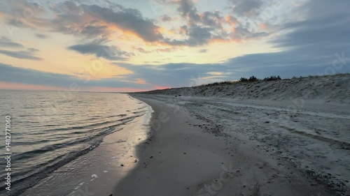 Tracking shot of sunset over the Baltic Sea: tranquil beach scene in Graal-Müritz, Germany.